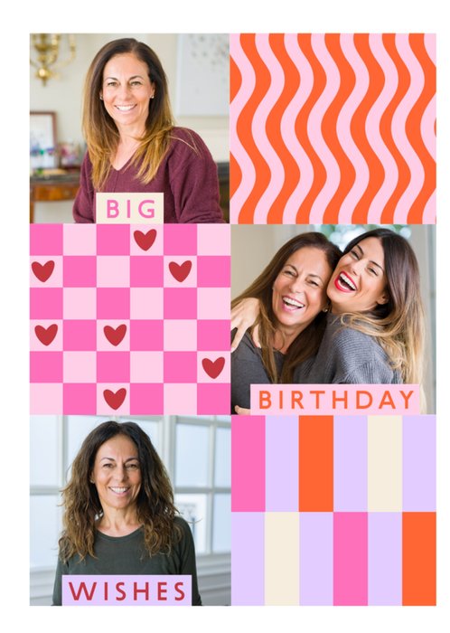 Featuring three photo frames in a modern collage layout, with a pink checkerboard, wavy orange stripes, and colourful blocks surrounded by a crisp white border.