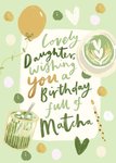 A beautifully illustrated birthday card for a daughter featuring a matcha-themed design with a latte, iced matcha, and a playful sentiment. The soft greens with gold accents, and hand-lettered typography, create a warm and stylish look, perfect for tea lovers.