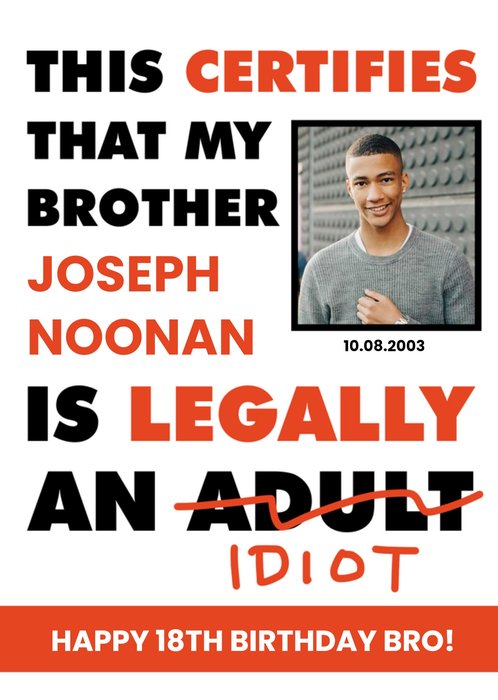"This certifies that my brother Joseph Noonan is legally an (adult) idiot", "10.08.2003" and "happy 18th birthday bro!". 'Joseph Noonan', '10.08.2003' and 'happy 18th birthday bro!' can be personalised!
