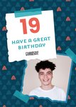 Blue and Orange Patterened Age Personalise Photo Upload Birthday Card