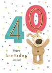 Featuring Boofle and a large number 40 on a colourful polka dot background.