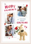 Features Boofle stood in the bottom, right corner of the card holding a red rose. There are three rectangular photo uploads on the card, surrounded by hearts.