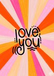 Bright graphic design featuring a pink, red, yellow and orange striped pattern with a non editable caption that reads Love You. The rear of the card has white background with the Corey Paige Designs and Moonpig logos