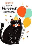 Bright fun and contemporary illustration of a Cat weraing a party hat and holding some balloons on a white background. The caption reads editable recipient's name, non editable Have a purrfect Birthday.