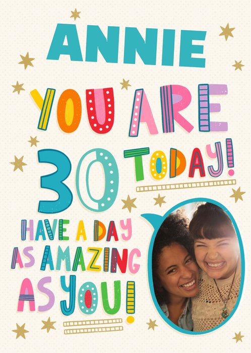 Brightly Coloured Typographic 30th Birthday Photo Upload Card