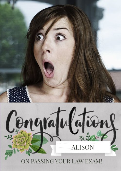 Front of Card: Congratulations On Your Exams Photo Upload Card Calligraphy decorated with roses. Text reads: "Congratulations Alison on passing your law exam!". 'Alison' and 'on passing your law exam!' can be personalised!