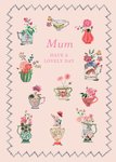 This greeting card design features a soft pink background decorated with an assortment of vintage-style teacups and vases filled with vibrant flowers, bordered by a zigzag pattern for a delicate and feminine aesthetic. The text on the card reads, “Mum Have a Lovely Day.”