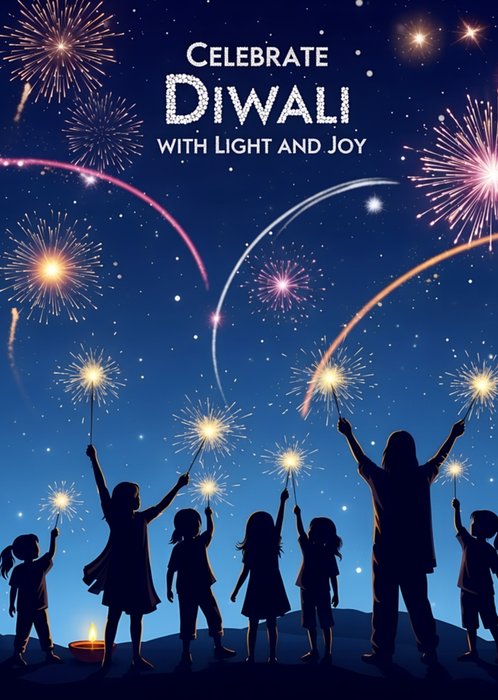 Illustration of a starry night sky filled with colourful fireworks while a group of silhouetted people hold sparklers, with a small diya glowing in the foreground and deep blue tones throughout.
