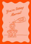 Features an illustration of a bottle of champagne being poured into champagne glasses balanced on top of each other. Design is in a pastel pink and orange colour palette.