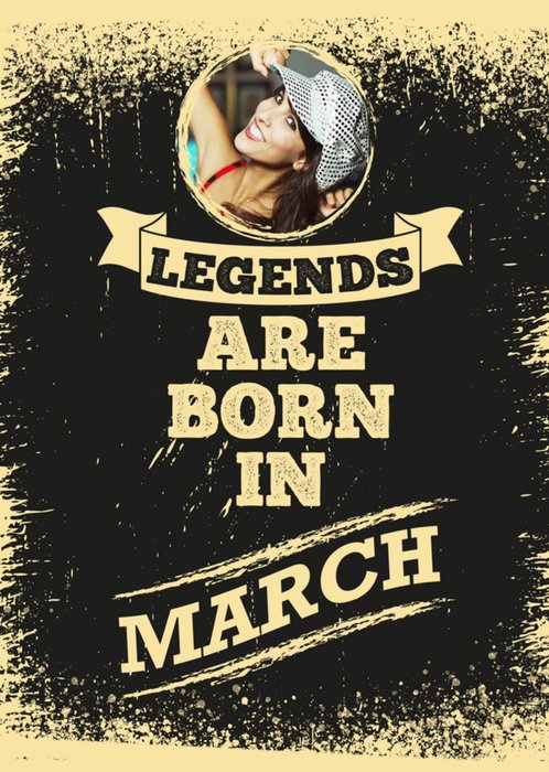 Front of card: Rustic, typography on distressed background with round photo upload at top of page. Text reads: "LEGENDS ARE BORN IN MARCH" With editable photo
