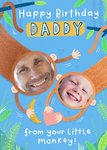 Front of card: Illustration of two monkeys swinging from the trees, with photo upload areas in their faces so you can add your own photos. Text reads: "Happy birthday Daddy. From your little monkey!"