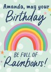 Front of card: Illustrated rainbow on polka dot pastel green background and colourful stars. Text reads: "Amanda, may your Birthday be full of rainbows!" With editable text.