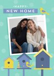 Front of card: Features a large photo upload in the centre of the card with an illustrated bird stood on the corner of the photo. Below the photo are 3 illustrated bird houses.