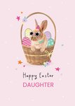 Front of card: Featuring a sweet image of an Easter bunny in a wicker basket full of Easter eggs while wearing star-shaped sunglasses. Behind, there are stars scattered on a light pink background. Text reads: "Happy Easter Daughter."