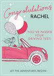 Front of card: Features an Illustration of a Female Character driving a car with Balloons with Text above and below. Text reads: "Congratulations Rachel You've Passed Your Driving Test! Let The Adventures Begin!" With editable name.