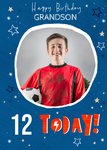 Front of card: Illustrated doodle stars on striped, blue background with photo frame in centre Text reads: "Happy birthday Grandson. 12 Today!" With editable recipient and age.