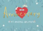Front of card: Floral Illustration surrounding a red heart shape with gold text. Text reads: "Happy Anniversary to my amazing girlfriend". With editable text. Back of card: Colette Barker logo. Moonpig logo.