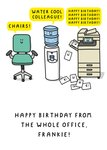 "Chairs! Water Cool Colleague! Happy Birthday! Happy Birthday! Happy Birthday! Happy Birthday! Happy Birthday from the whole office, Dave!"