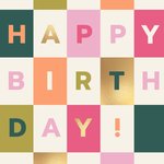 Featuring a colourful grid pattern with bold letters and gold foil accents on a cream background.