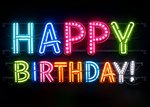 Featuring bright, multicoloured neon-style lettering that spells out 'Happy Birthday!' on a black background.