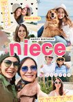 Featuring a collage of six personal photos with playful stars, hearts, and bows, and bold pink text for 'niece' on a cream and pastel coloured background.