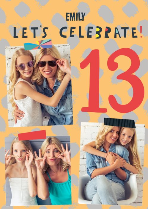 Front of card: Triple photo upload with large red number 13 on the right-hand side with funky 'Let's Celebrate' lettering above. All on an orange background with grey dots. Editable name at the top, Text reads: "Emily. Let's Celebrate. 13." With customisable name.