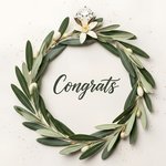Featuring a cream greeting card with a circular wreath of green leaves and buds, topped with a white flower and diamond detail, surrounding elegant script in the centre.