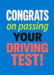A bold and colourful greeting card featuring large, multi-coloured text in cream, lime green, black and coral on a bright blue background.