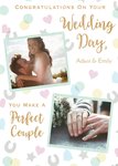 Front of card: Features two small Photo Uploads with gold text above and below. Text reads: "Congratulations on Your wedding Day Adam & emily You make a perfect Couple". 'Names can be personalised!