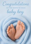 Close-up photograph of baby feet resting on soft blue fabric with elegant script and serif text above.