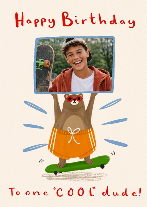 Featuring an illustration of a bear in sunglasses and orange shorts riding a skateboard, holding a photo upload frame above it's head, on a cream coloured background.