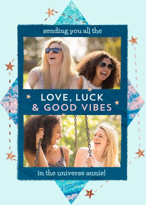 "Sending you all the love, luck & good vibes in the universe annie!". 'Sending you all the love' and 'in the universe annie!' can be personalised!