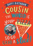 Cousin The world Is Your Pizza Photo Upload Birthday Card