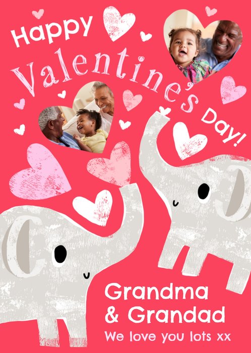 Front of card: A sweet and sentimental Valentine's Day card to grandparents featuring a hand-printed style illustration of two cute elephants blowing love hearts out of their trunks. Two of the hearts feature photo upload areas and act as the frames for these photos.