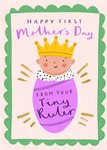 Featuring a cute illustration of a baby wearing a crown, wrapped in a purple swaddle with gold rays, framed by a green scalloped border with text above on a pale pink background.