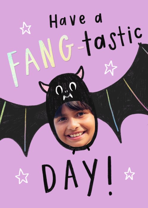 Cute hand drawn bat with outstretched wings and a circular face photo upload area, surrounded by playful lettering on a lilac coloured background.