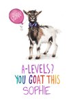 "A-LEVELS? YOU GOAT THIS SOPHIE" with editable name text.