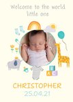Illustrated frame with elephant, giraffe, rainbow, socks, building blocks, dummy, baby grow, balloon and photo upload in center.