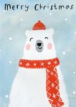 Featuring an illustration of a cute polar bear wearing a red woolly hat and scarf with snow falling around.