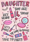 Front of card Cute Illustrations of Make up tools around the card. Text says: Daughter You Are 14 Today Get Ready Let's Dance We Love To Boogie Time To Party