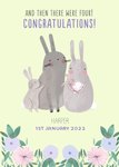Cute illustration of a Mummy, Daddy, Sibling and Baby Rabbit, surrounded by flowers and foliage. Congratulations message, name and date of birth areas above and below.