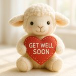 Featuring a fluffy lamb soft toy holding a red heart with the words 'Get Well Soon' stitched on it.
