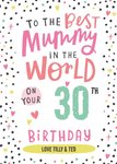 Front of Card: Illustrated heart, star and polka dot pattern border with large pastel coloured typography in center on white background Text reads: To the best Mummy in the world on your 30th birthday love Tilly & Ted. With customisable names and age.