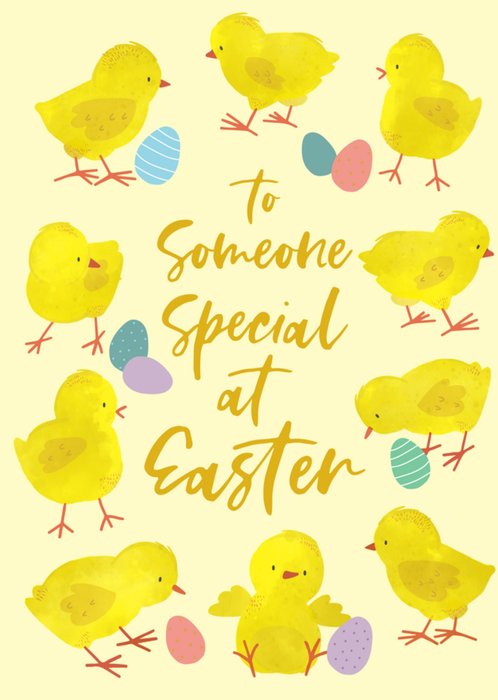 Featuring lots of yellow water colour style baby chicks and pastel patterned eggs around the edge of the card. In the centre is hand lettered wording on a pale yellow background.
