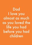 A cheeky and playful greeting card with bold white text corrected by hand-drawn black scribbles, turning a silly insult into a sweet Father's Day message on a bright red background.