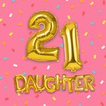 A modern, fun design featuring large gold balloons arranged into a '21 Daughter' message surrounded by colourful confetti. The design has a pink background.
