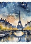 Front of card: Featuring an AI-generated hand-painted, watercolour-style illustration of a starry night in Paris with the Eiffel Tower in the centre with a bridge going over the river Seine.