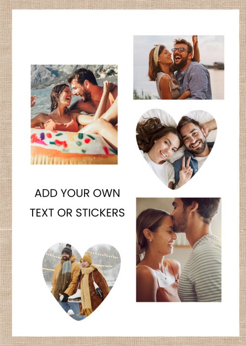 A modern design Featuring five photo frames in mixed rectangle and heart shapes with a beige border, on a white background. The design allows for fully editable text boxes, letting you create a truly personalised card.