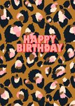 This Eleanor Bowmer greeting card design presents a vibrant and playful leopard print background in shades of tan, black, and pink, overlaid with bold red letters that proclaim a celebratory message, “Happy Birthday”.