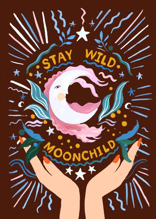 Front of card: This ‘Eleanor Bowmer’ greeting card design features a crescent moon sat on a pink cloud, surrounded by stars and blue and white rays on a brown background. A pair of hands are placed at the bottom of the card as if they are cupping the moon.